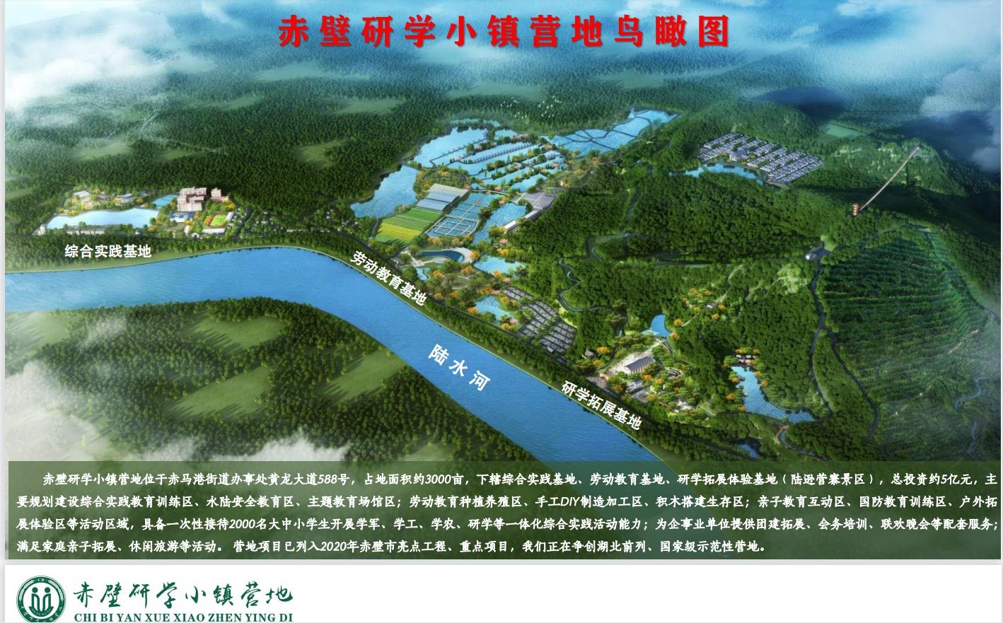 赤壁研學(xué)小鎮(zhèn)營(yíng)地是由赤壁城發(fā)集團(tuán)下屬合資控股企業(yè)赤壁市和安中小學(xué)生社會(huì)實(shí)踐基地有限公司建設(shè)項(xiàng)目。營(yíng)地位于赤壁市赤馬港街道辦事處黃龍大道588號(hào),占地面積約3000畝,總投資5億元。下轄綜合實(shí)踐基地、勞動(dòng)教育基地、研學(xué)拓展體驗(yàn)基地(陸遜營(yíng)寨景區(qū)),具備一次性接待近2000名大中小學(xué)生開展學(xué)軍、學(xué)工、學(xué)農(nóng)、研學(xué)旅行、親子游等一體化綜合實(shí)踐活動(dòng)能力;為企事業(yè)單位提供團(tuán)建拓展、休閑旅游、會(huì)務(wù)培訓(xùn)、聯(lián)歡晚會(huì)等配套服務(wù)。