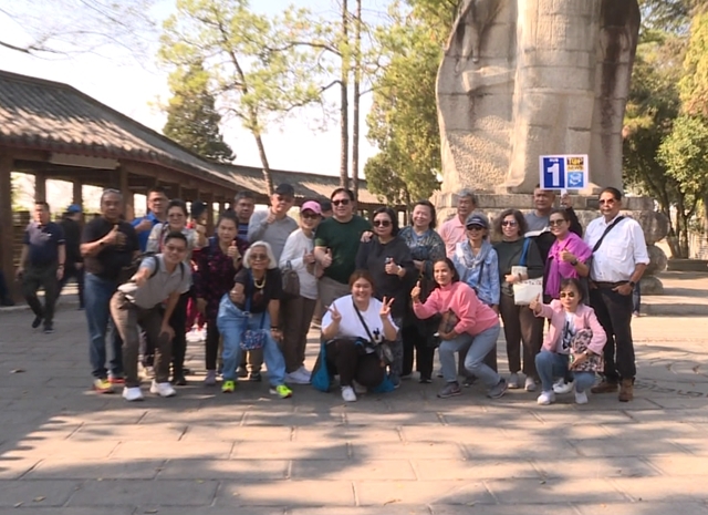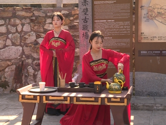 下午兩點,泰國游客乘坐提前準備的景區(qū)觀園車游覽三國赤壁古戰(zhàn)場。赤壁山上,周瑜練兵、小喬奉茶等極具三國特色的精彩表演將游客穿越到1800多年前的赤壁之戰(zhàn)的戰(zhàn)場上;赤壁摩崖石刻、周瑜石像下,泰國游客們紛紛拍照打卡,沉浸式體驗三國文化,深刻感受赤壁歷史名城的深厚文化底蘊。