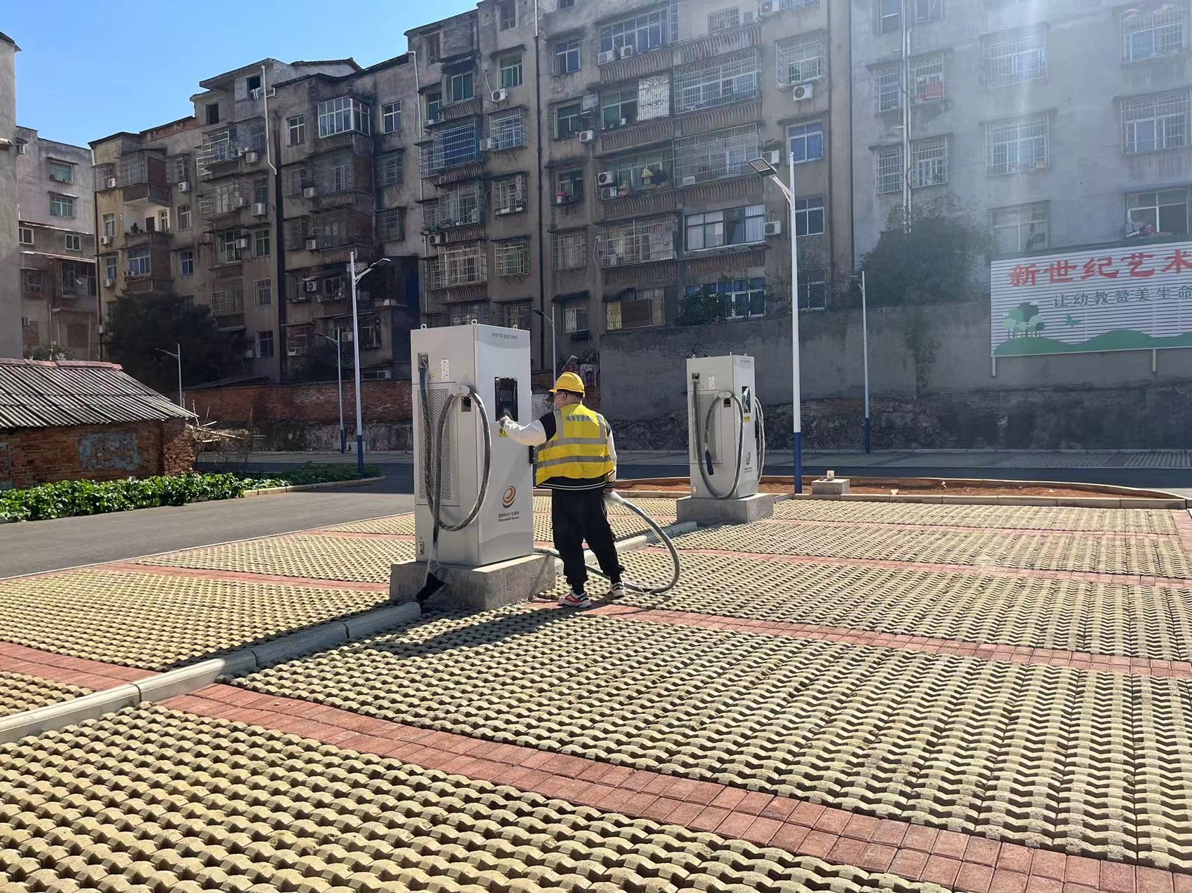 11月2日,在市實驗中學(xué)停車場內(nèi),赤壁城發(fā)集團工作人員正在對新能源汽車充電樁進行調(diào)試。
