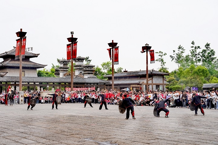 “同學(xué)們往這邊看,公元208年著名的‘赤壁之戰(zhàn)’就是在這里爆發(fā)的。”在導(dǎo)游聲情并茂的解說下,師生們興致勃勃地游覽了拜風(fēng)臺、鳳雛庵、周瑜石像、摩崖石刻等景點游覽;觀看了《趙子龍救主》《開園迎賓》等實景表演,通過親身體驗歷史場景,了解三國歷史背景、著名戰(zhàn)役和人物故事,打開了對歷史興趣的大門。