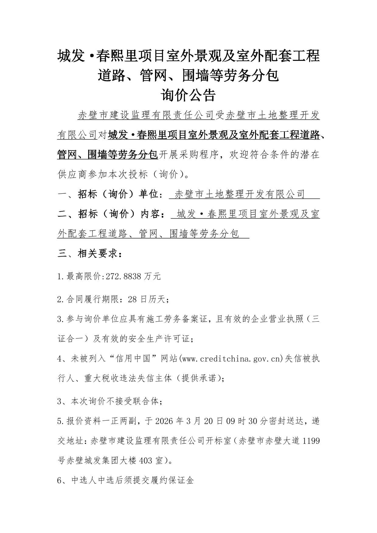 城發(fā)·春熙里項(xiàng)目室外景觀及室外配套工程道路、管網(wǎng)、圍墻等勞務(wù)分包詢價(jià)公告