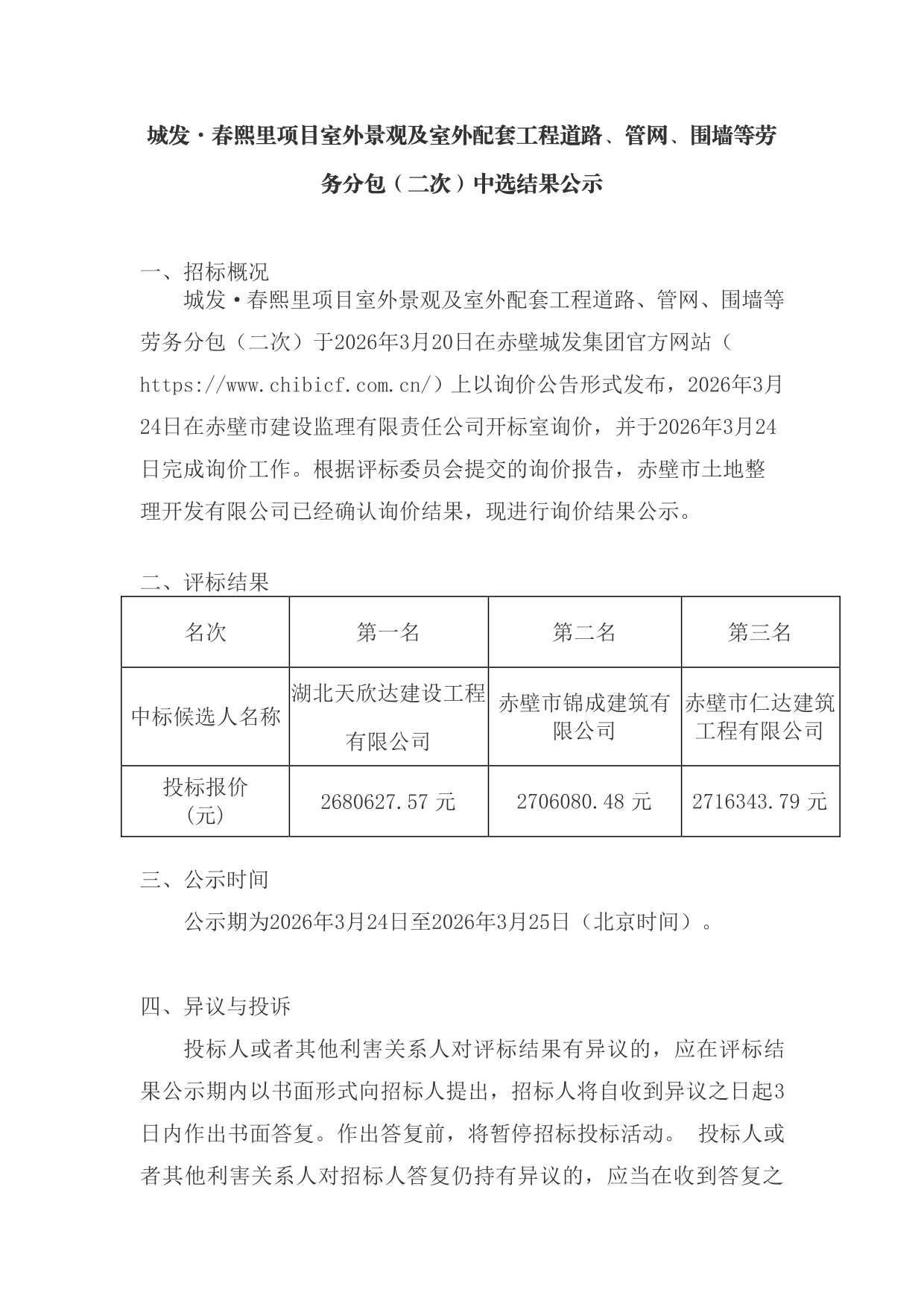 城發(fā)·春熙里項(xiàng)目室外景觀及室外配套工程道路、管網(wǎng)、圍墻等勞務(wù)分包(二次)成交公示