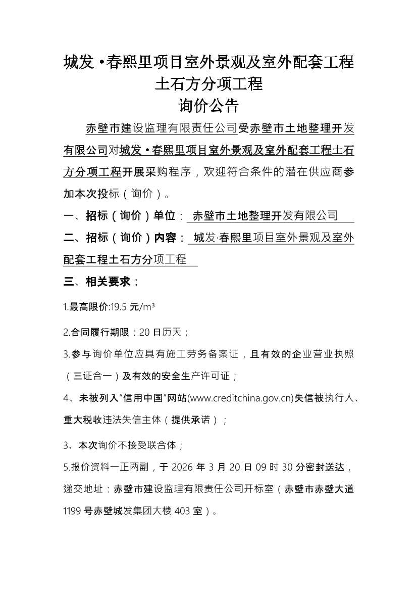 城發(fā)·春熙里項(xiàng)目室外景觀及室外配套工程土石方分項(xiàng)工程詢價(jià)公告