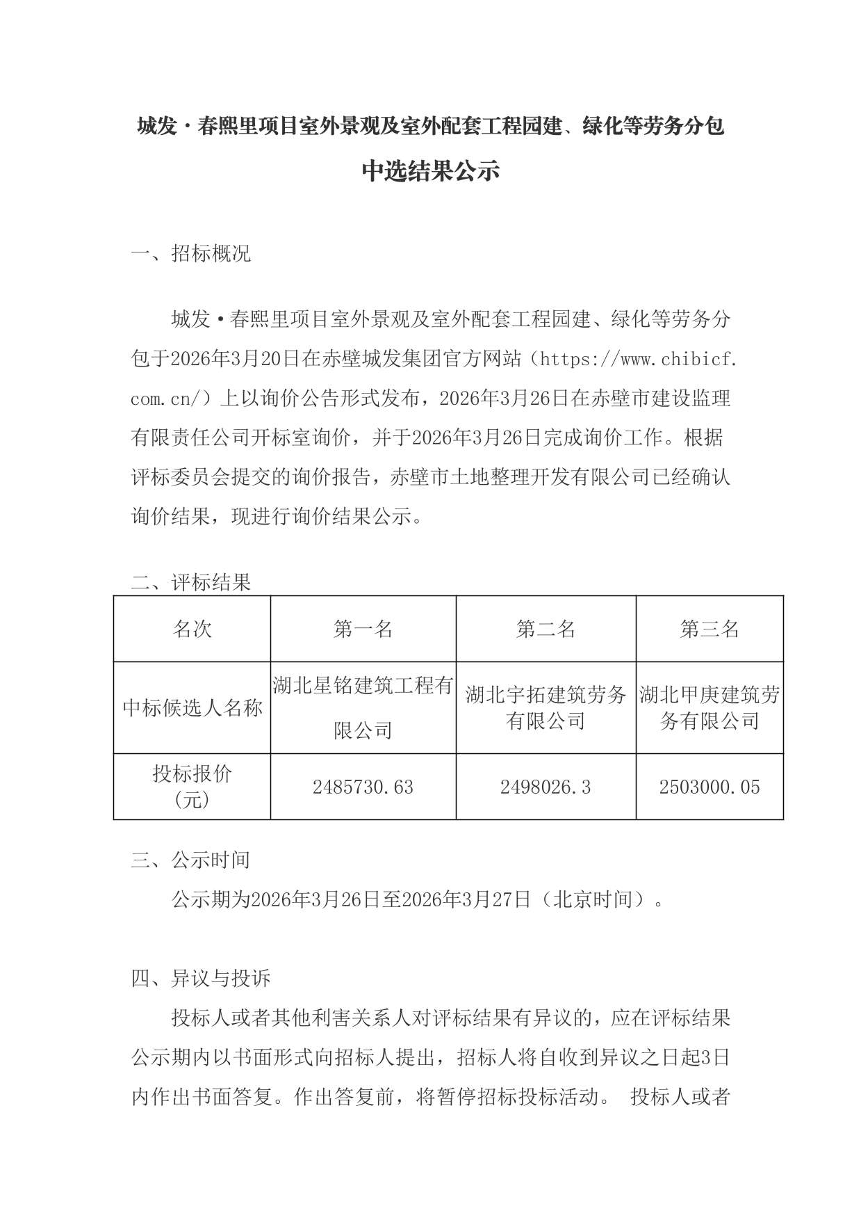 城發(fā)·春熙里項目室外景觀及室外配套工程園建、綠化等勞務(wù)分包中標(biāo)結(jié)果公示